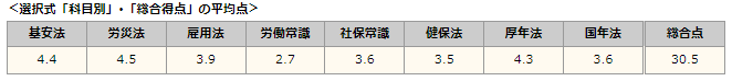 安全衛生普及センターの独自の集計データより、第56回社労士試験の選択式の科目別・総合得点の平均点です。
