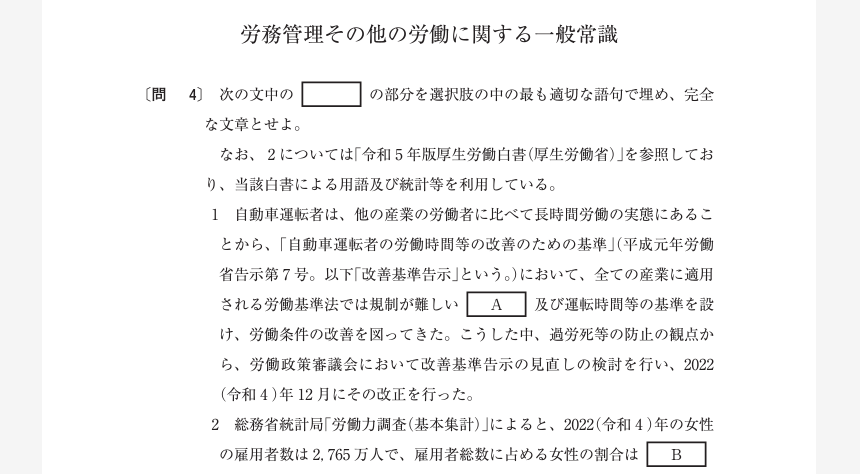労務管理その他の労働に関する一般常識については、問題文1は告示からの問題で難しかったです。問題文2は統計(労働力調査)で対策してきた方も多いと思いますが、内容が難しい内容でした。過去に出題された調査に関する内容で、対策をしていた受験者もいたかと思われますが、内容的に自信を持って正解肢を選ぶのは難しいところです。