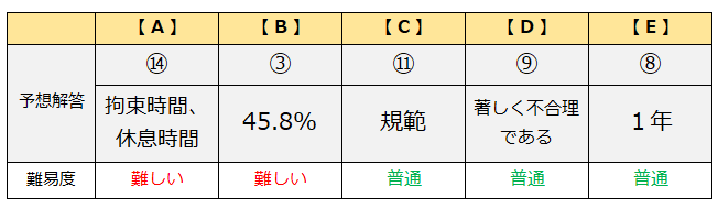労務管理その他労働に関する一般常識(以下労一)の選択式問題の予想解答・各問の難易度です。