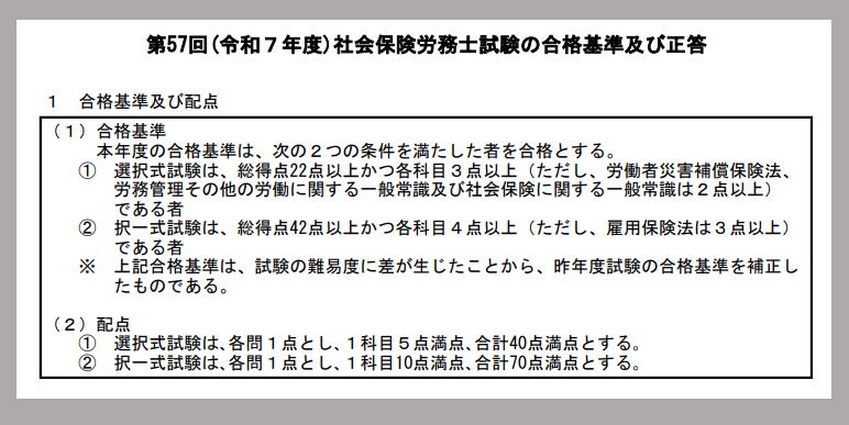 ①選択式試験は、総得点22点以上かつ各科目3点以上(ただし労災・労働一般・社会一般 2点以上)
