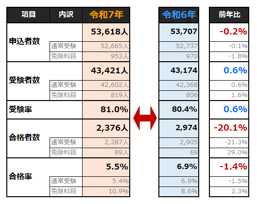 合格率はなんと5.5%!令和に入ってワーストだった令和4年の5.3%より高いですが、それでも低い…