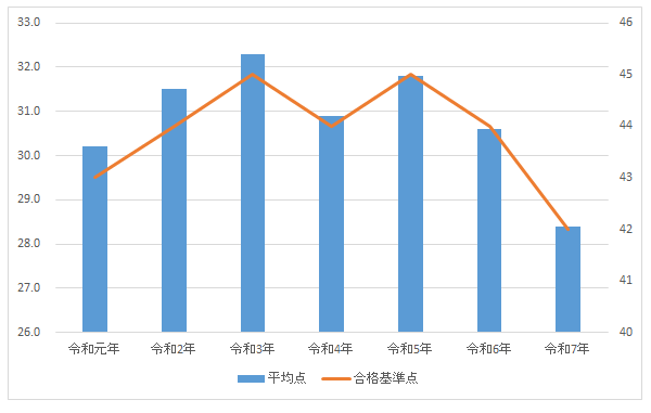 ・令和7年:(平均点)28.4点(合格基準点)42点