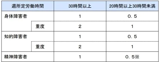 ※印の部分です。原則は「0.5人」とみなされる週20時間以上30時間未満勤務の精神障がい者について「1人」としてカウントする特例措置です。