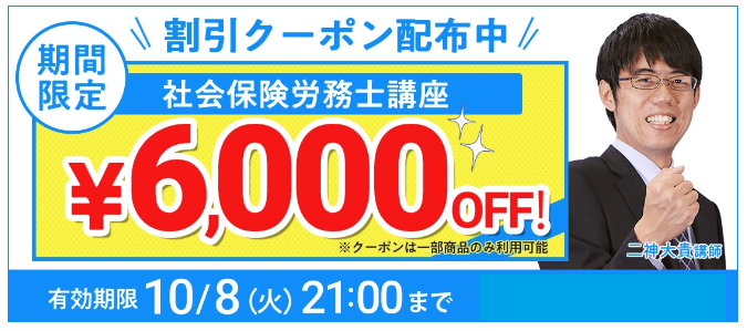 現在、社労士講座フォーサイトで配布中の「6,000円割引クーポン」が、本日10月8日(火)21時までとなっています。