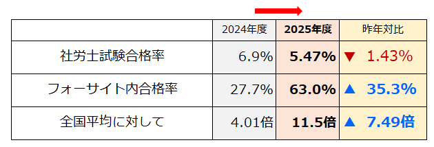 社労士講座フォーサイト 2025年度試験の合格実績・昨年比較