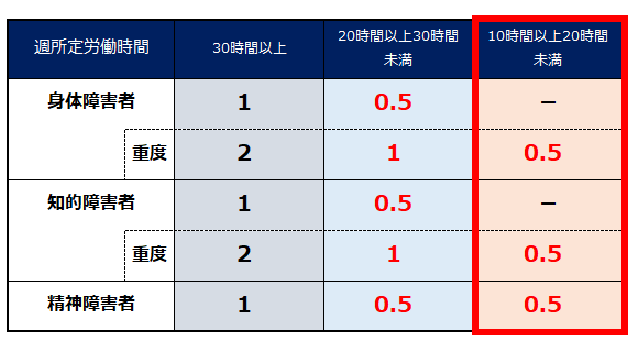 ※精神障がい者については、障がいの程度に関わらず、週10時間以上20時間未満の労働者を「0.5人」として算定します。