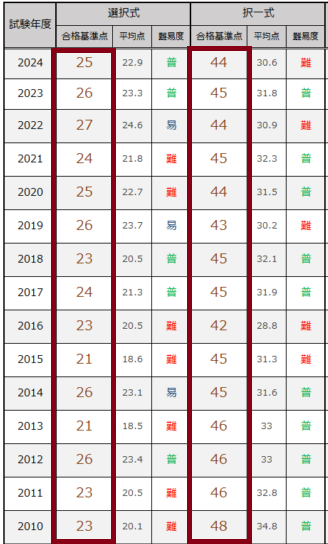 選択式の合格基準点はこの15年間で21~27点、満点が40点なので、52~67%正解できれば合格です。