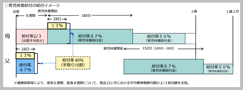 ※配偶者が専業主婦(夫)の場合や、ひとり親家庭の場合等には、配偶者の育児休業の取得を求めずに給付率を引き上げ