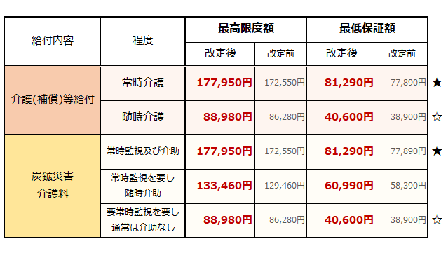 介護(補償)等給付・介護料の最高限度額・最低保障額の改定
