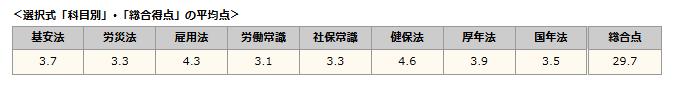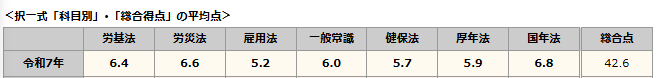 安全衛生普及センターの独自の集計データより、第57回社労士試験の選択式の科目別・総合得点の平均点です。