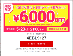 今回の誰でも使える6,000円割引クーポンの配布は、5月20日(月)の21:00までとなっています。以下割引価格まとめです。