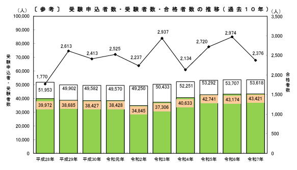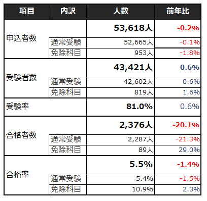 以下、申込者数、受験者数、受験率、合格者数、合格率のまとめ、昨年との比較です。